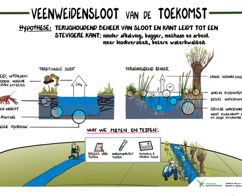 We onderzoeken hoe de toekomstbestendige veenweidesloten bijdragen aan doelstellingen op het gebied van biodiversiteit, klimaat en landbouw. Het doel is om inzicht te krijgen hoe zo’n sloot eruitziet, welk beheer nodig is om dit te bereiken en te behouden. Dit geldt voor zowel de huidige situatie als voor wanneer slootwaterpeilen hoger en dynamischer worden.