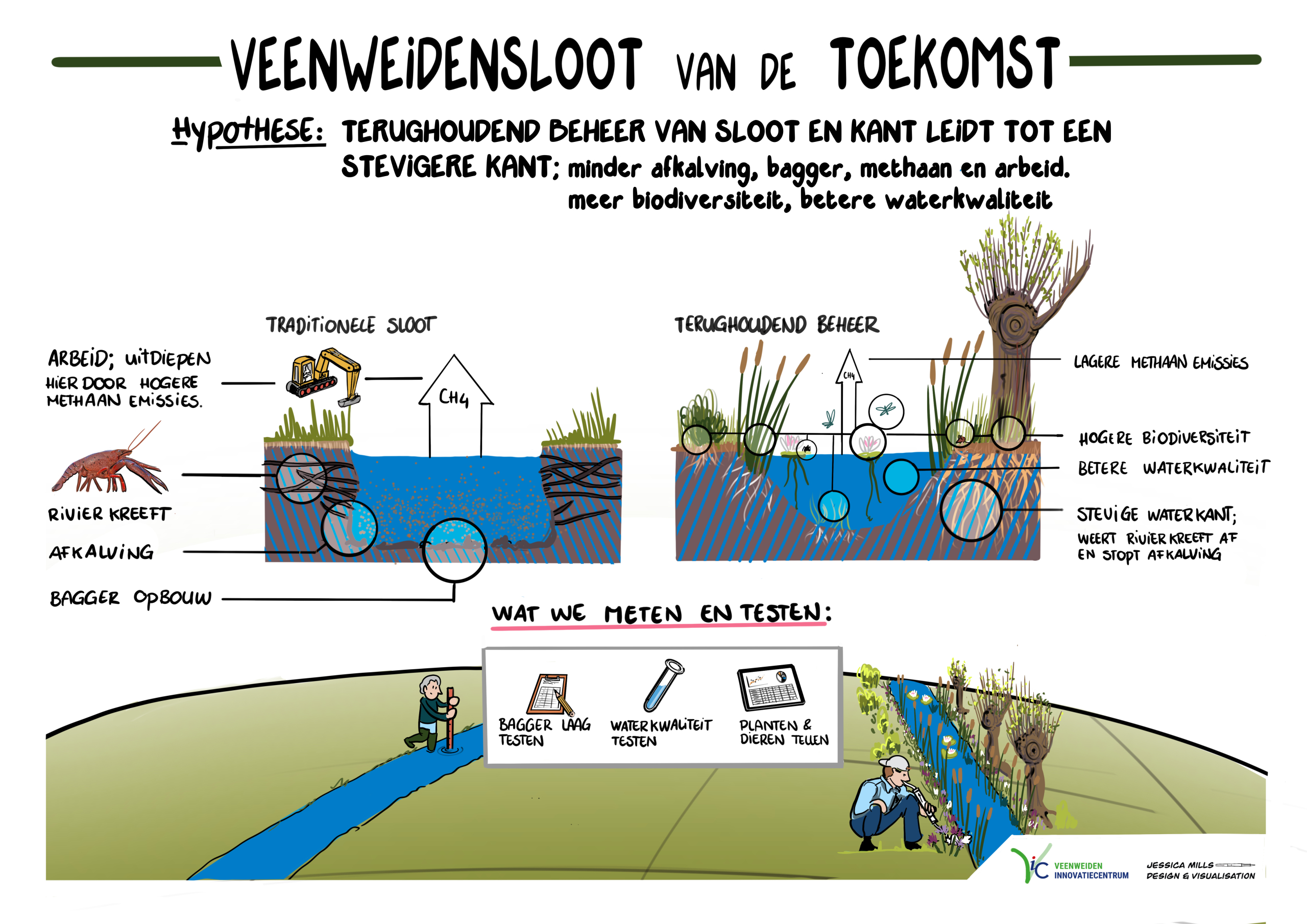 Met een aangepast ecologisch beheer van sloot, oever, perceelrand en perceel kunnen we de negatieve effecten van toekomstige peilverhoging van de sloot opheffen en een goed functionerende en toekomstbestendige veenweidesloot realiseren. Deze sloot heeft een hoge biodiversiteit, een stabiel profiel met stevige kanten, minimale baggeraanwas en broeikasgasemissies. Het agrarisch beheer dat is gericht op biodiversiteit in en om de sloot en een optimale agrarische productie op het perceel wordt ook maatschappelijk gewaardeerd.